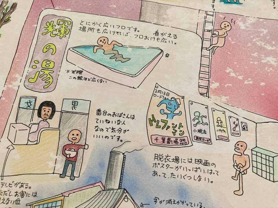 幼少の頃から銭湯通いだったこともあり、今でも昔ながらの銭湯が大好きである。銭湯では、かなりの確率で大きな富士山の絵が描かれている。それを観ながらゆったりとお湯に浸かるというのが日本人的な嗜好でもある。これは海外から見ればかなり異質で興味深いことだと思う。大学時代も銭湯通いで、よく湯気を立てながら夜の授業を受けていたこともあった。グラフィックの課題でも、銭湯マップを作成したら上位の評価をもらった(写真1)。