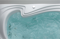 まあ、こんな感じでお風呂は大好きなのだが、本業のデザインの仕事でもお風呂をデザインしてきた。TOTOのスーパーエクセレントバスシリーズは、およそ四半世紀経った現在でも好調な売れ行きのロングセラーである(写真2、3)。それまでは、上から見て左右対称形の浴槽を思い切って、左右非対称の自然の景色のメタファーとして造形した。すると、無機的な形状の浴槽とは異なる、自然界の露天風呂にいるような気持になってくる。それまでは、浴槽の図面はすべて上からのビューで考えていたのを、3D CADで入浴中の視線を考えながらデザインしてみたらこのようなデザインになった。電化製品と違って一度買ったら20年以上は使うアイテムでもあるため、長く売れ続けているのは作者としてもとても嬉しい。