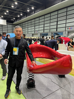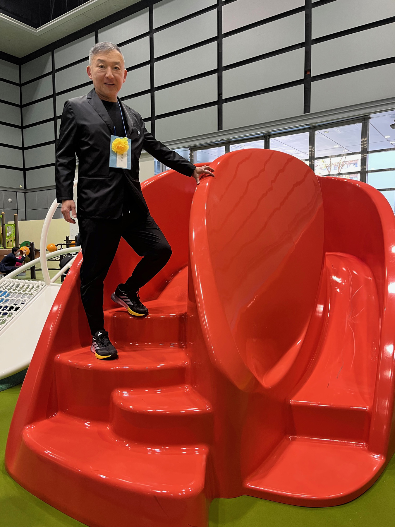 ▲「未来は、あそびの中に。」未来を担う子供たちにこそ良質のデザインで遊んでほしい。幼少の遊びの記憶が想像力を伸ばす。株式会社ジャクエツさんから発売中の滑り台「マウンテン」と筆者。2025年2月開催された展示会「共遊空間EXPO/こども環境サミット」より。(クリックで拡大)