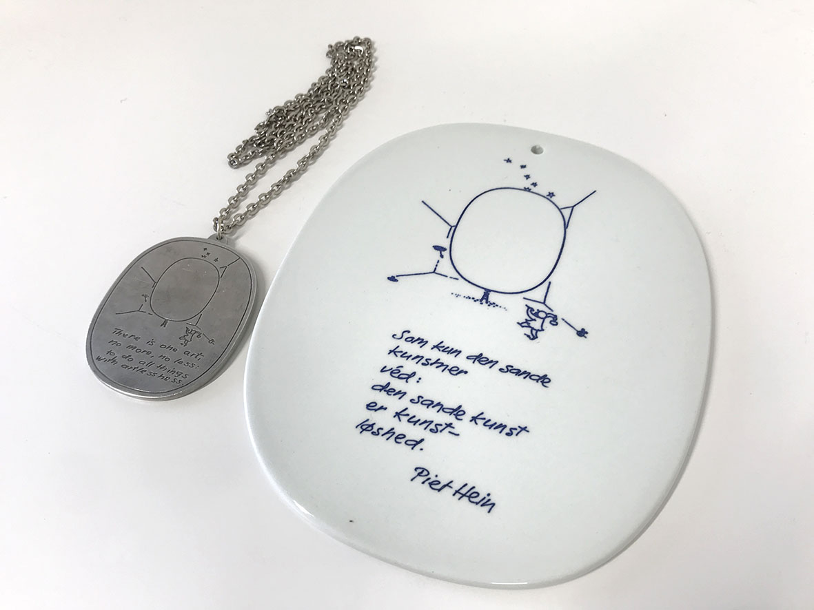 著者はピート・ハイン好きが高じて、磁器製のウォールプレートとピューター製のネックレスを所有している。デンマーク語の「笑い」と「ため息」を合わせた彼の造語である「グルック/GRUK」という名の短い詩がスーパー楕円の作品を製作するアーティストのイラストとともに記されている。ウォールプレートにはデンマーク語、ペンダントには英語で以下のように書かれており、どちらもピート・ハイン本人によるもののようだ。