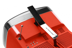 操作系は背面に美しく配置されており、ハンドルは、ブラウン管の画面寄りに重心があるのに合わせ斜め前にせり出してくる。全体のフォルムは低いところに置いても見やすいよう画面が上向きになっており、その逆くの字の姿形とツヤっと丸みを帯びたスクリーンカバーがこっちを見上げた子犬のようになんとも人なつこいかわいさである。カタログのデザインもモダンで美しかった。
