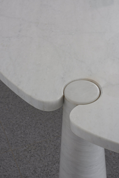 そして、すべて理詰めで語れるフォルムに鏡面の仕上げや面取りの仕方が艶っぽさを加えているのです。特に大きめの面取りは大理石の柔らかさを感じるし、また脚部と天板の接合部分はこの面取りが相手を誘い込むジェスチャーのようにも見えます。