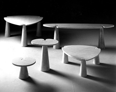 この「EROS」は円錐形の脚に穴の開いた天板を嵌め込み、天板の自重によって成立しています。至極単純な力学的アイデアですが、これが「神」の御技としか思えないバランスなのです。素材の大理石の重さ、硬さ、加工性など物的特性を知っていなければ実現できないデザインだと感じました。