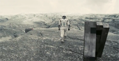 やや反則気味ではあるが、少し視点をずらしてフィクションの世界を思い浮かべてみた。映画の中で出会うデザインだ。中でも強く印象に残るのがスタンリー・キューブリック監督作品「2001年宇宙の旅」に現れる黒い板、モノリスである。1:4:9の平方数の比率の金属のような質感の直方体で、エッジはピシッと立っている。表面はなめらかでややマット系、砂漠の中に置かれても月の中に埋められてもキズ1つなく直立している。重そうにも見えるが質量は不明。特に印象的な冒頭のシーンでは猿人や荒廃した砂漠との対比も相まって完璧な立体物としての存在が強調されている。