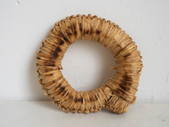 米を収穫した後に副産物である藁を整えて、巻いて、縛っての繰り返しでできた丸い造形。どこかで見たイサム・ノグチの輪っかの彫刻のような力強さだ。制作した人の手の力加減が、藁の太さや丸の大きさ、強度に直接影響してくる。