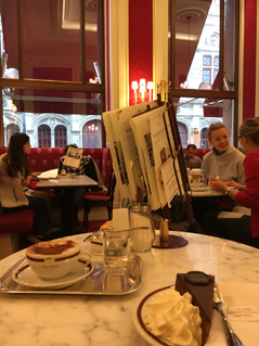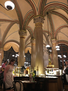 ▲カフェ ツェントラル。中央のショーケースに洋菓子がずらりと並ぶ。大理石の柱、床、テーブルが艶やかに光を反射していた。(クリックで拡大)