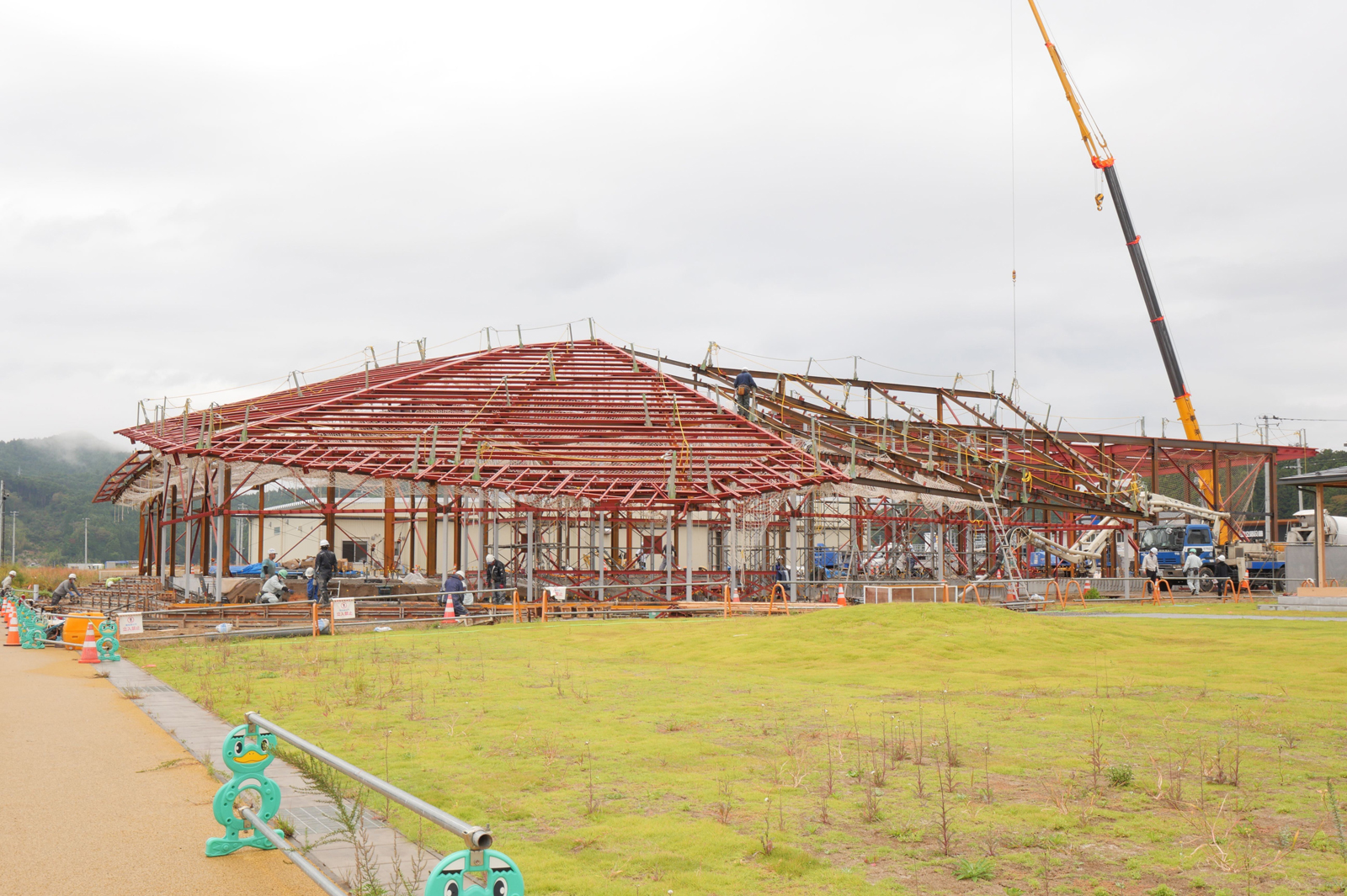 先月上棟し、内部空間が見えてきた。海の方向へ風景が切り取られ、場所によって高さの変わるダイナミックな天井である。来年春に、扇形天井の完成するのが待ち遠しい。