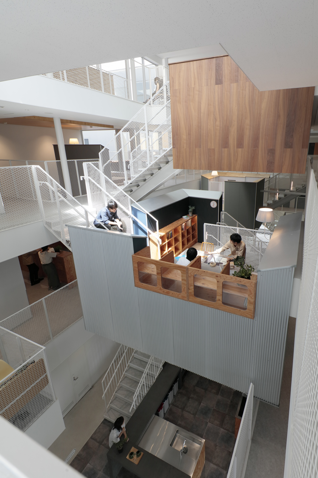数年前に竣工した「まちのような国際学生寮」という大学の寮がある。200人程の留学生と国内学生がともに生活をする寮では、日常のなかで交流のきっかけとなる要素が求められた。4層の吹抜けのなかに浮遊するポットと名付けた階段の踊り場のような居場所はフロアを横断した学生同士の関係が生まれるだろうと想定した。寮室の扉の横にある有孔ボードは自己紹介ボードとして自己発信のきっかけを想像した。