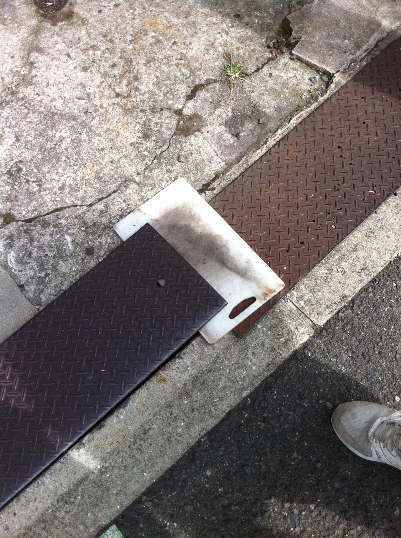 例えば道路と敷地のあいだに設けられた側溝のある風景。その溝蓋は縞鋼板でできており、側溝の上に敷き詰められている。ところがその一部の溝蓋間に「まないた」がはさまれている。樹脂製のそれはなんでそんなところにある(いる)のか? 敷地内に目をやると車が駐車されている。この状況から我々が出した結論はこうだ。