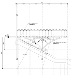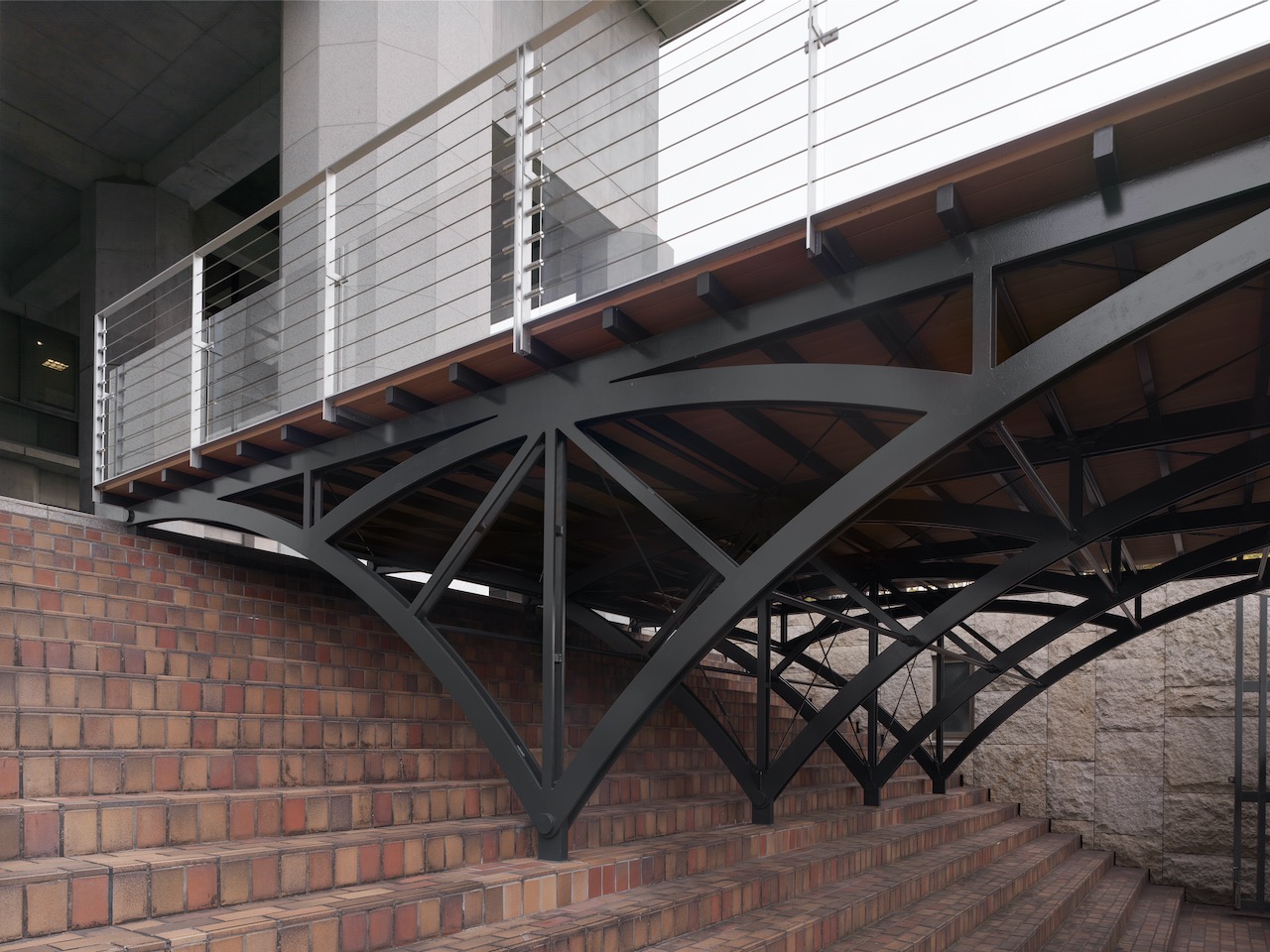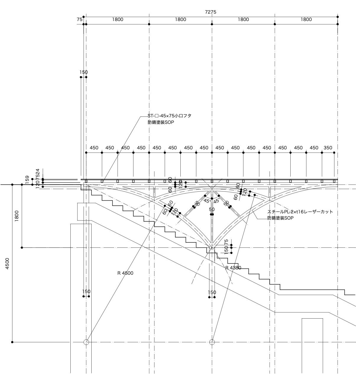 16ミリ鉄板を50ミリ離して2枚1組にして、階段の上部と中間点で支えるアーチ型の梁を4枚並べ、その上に角パイプの根太を渡してデッキを貼った、極めてシンプルな構造である。アーチの支点が階段上にあることと、ステージと階段上部との段差を極力小さくすること、しか変数がなく、かえってアーチの形状を決めるのに迷ってしまった。