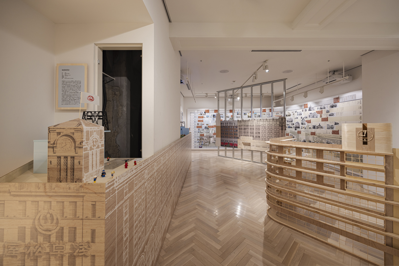 2022年9月から2023年2月まで日本橋髙島屋百貨店で開催された「百貨店展」は、約10mほどの巨大な年表がメインの展覧会だ。ただ年表だけだと百貨店に思い入れがある世代しか楽しめないと思い、大きな模型を3つ置いている。コストも限られていたことから、すべて合板でつくっているが、建築家が会場構成をした展覧会では合板が使われることが多いので、それこそちょっと細部にひねりを加えることにした。