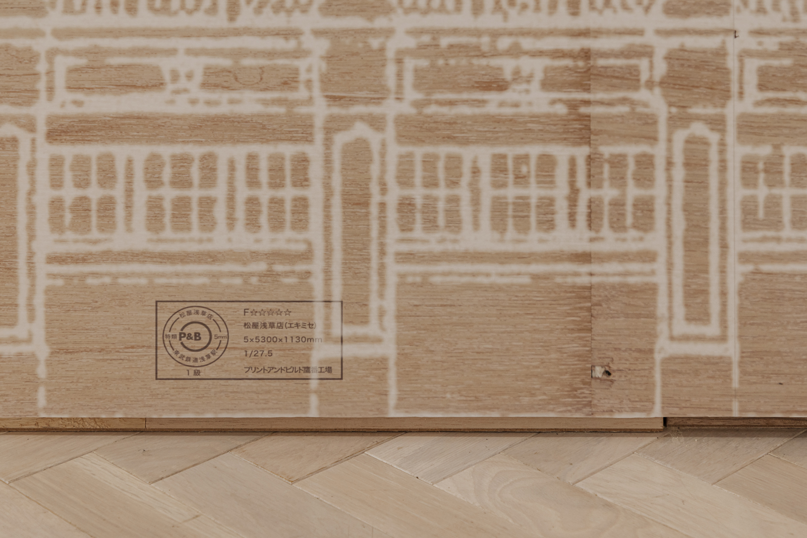 ▲松屋浅草店の模型の詳細。表面の合板はプリント。リアルに見えるようにビスの跡がある合板を撮影した。判子のデザインもオリジナル。© morinakayasuaki(クリックで拡大)