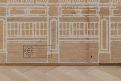 さらにそれぞれの下地も変えており、写真の部分は5.5mmのラワン合板の上にグラフィックシートを貼り、手描き図面の部分は茶色いレンガと白い大理石を表現するため9mmのラワン合板とシナ合板の上にトレーシングペーパーを乗せ、CADデータの部分はラーチ合板を白く染色した上に直接UV塗装を致してある。また、これらの合板はLGSに直接貼り付けれているので、壁が浮かんているような不思議な見え方になる。