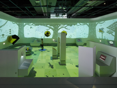 その舞台は、1000年後の世界というストーリーを補完する、不安定で異形の造作物が点在する空間で、それらは映像を投影され、センサーと連動することで初めて機能します。一言で言うと、人と空間とがデジタルを媒介に接触するような場所です。もともと好きだったビデオゲームと実空間を結び付けることができたプロジェクトで、10年以上前の技術で実現したのですが、その先見性は行動に対するリアクションが可視化され、自身に経験値として反映されるゲーム性にあったのだと思います。