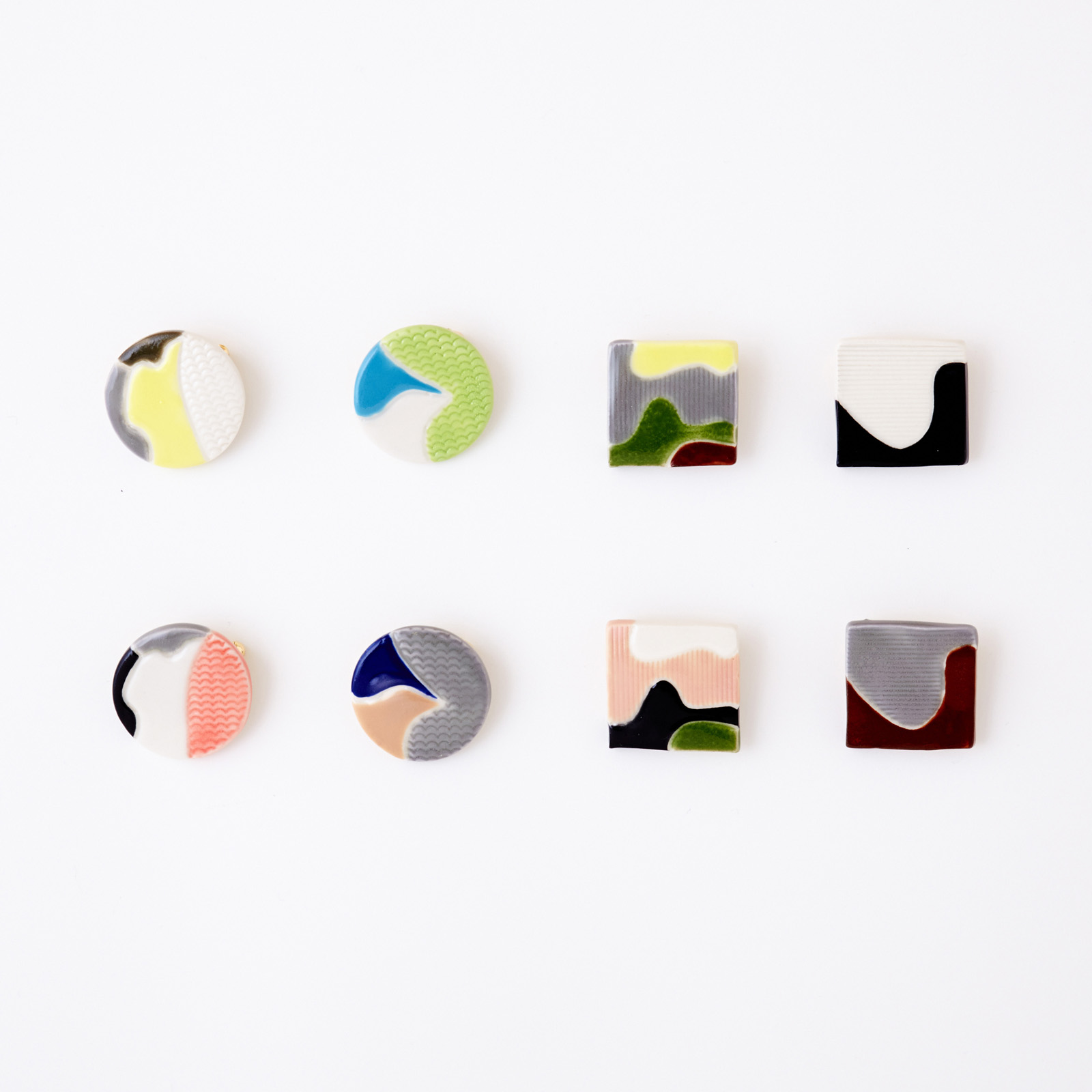 「都道府県ポーズ全国大会」は、各都道府県の形に無理やりなポーズを取ったキャラクターで日本列島を作っています。かたちありきでそこにキャラクターを当てはめていく、という作り方で、これはお題探しからがもうデザインのスタートになっています。また、日本列島の一部をズームアップして切り取り、その図形からデザインを起こした磁器のブローチも作りました。丸と四角の紙製の窓を作り、日本列島に当てながら切り取る箇所を探したのですが、全体を見ているときには気がつかない魅力的な線が次々と窓の中に現れ、すごく新鮮でした。