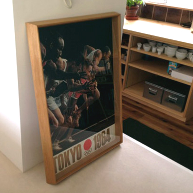 そんなある時、新しく発売された木製の額の広告写真(D&DEPARTMENT)を見た。額自体もとても素敵なものだったのだが、額装作品に目を引かれた。その一番大きなサイズ、B1の額に収められていたのは、亀倉雄策氏が作った1964年の東京オリンピックのポスターだった。このポスターは4種類あり、時期を変えて発表されたものであるが、額装されていたのは二番目のもの、陸上競技のスタートダッシュの一瞬を捉えたものであった。