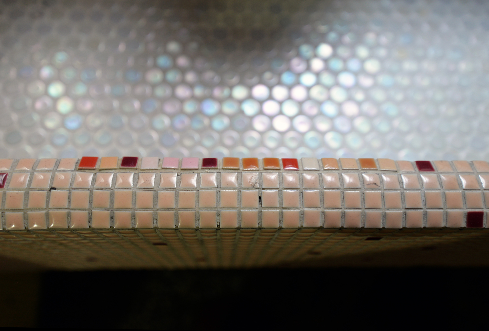 館内の共同トイレや風呂場を覗いては、這いつくばって舐めるように眺める……そんな変態的な動きを繰り返している中で、洗面台の1つに目がとまる。1センチ角にも満たないモザイクタイルのランダムな柄の中にちょっと変わった並びが混ざっている(写真1)。似たような色合いながらも異なる数種類の色でバランスよく埋められた可愛らしい洗面台の縁(写真2)。同色のタイルのストックがなかったからなのか、むしろそれがお洒落な風合いだ。