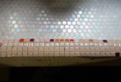 ふと別の洗面台を見てみると、ここも同様。一番痛みそうな部分のタイルが張り替えられている。こちらはランダムに形状の違うタイルが並んでいるが、そこをまた異なるタイルで不自然にならないように綺麗に埋められている(写真3)。
