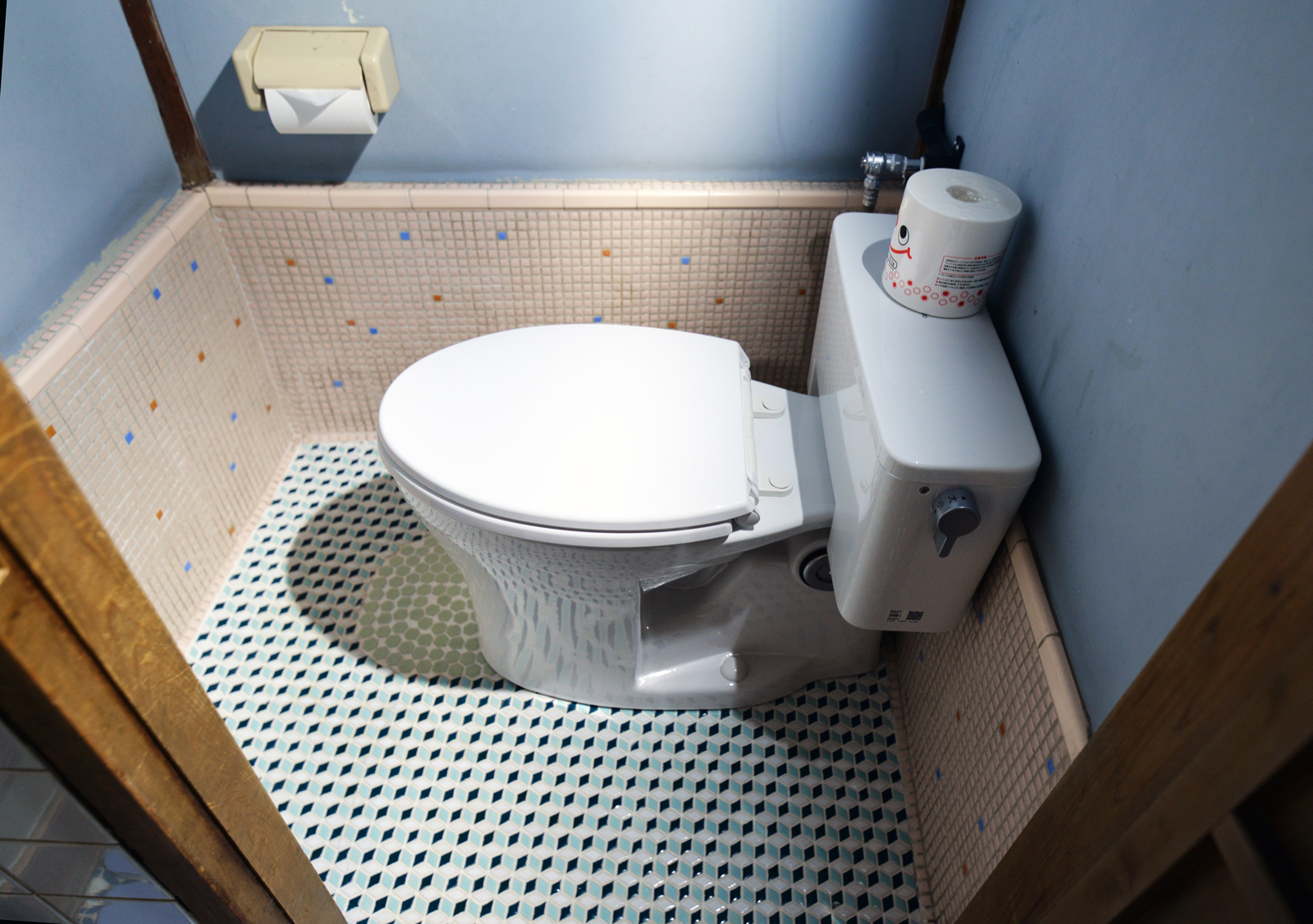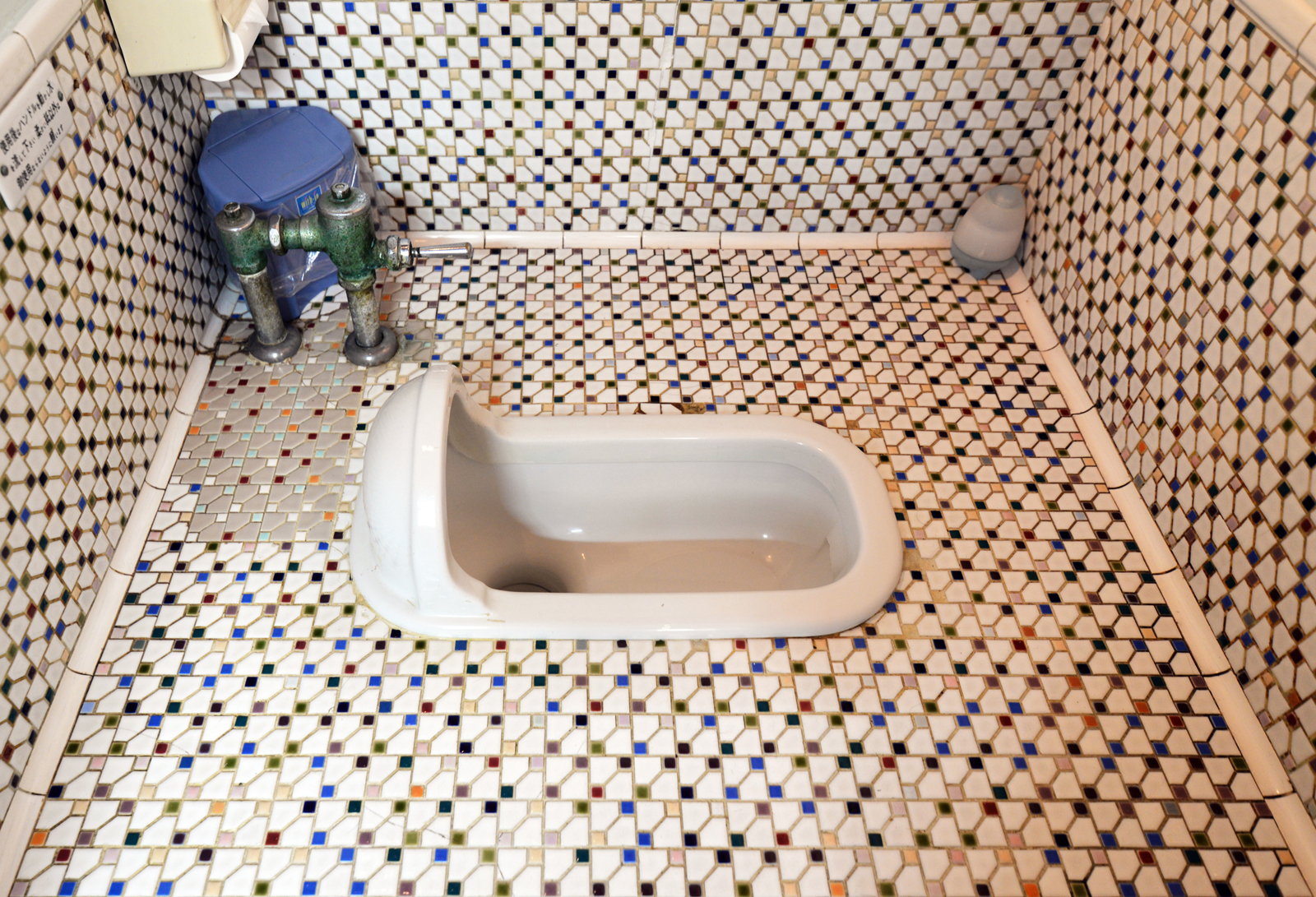 ▲写真4:同旅館のトイレの1つ。左上部分を色違いのタイルで補修。(クリックで拡大)