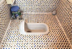 ▲写真5:同旅館のトイレの1つ。便器を和式から洋式にした際の痕跡をタイルで補修。(クリックで拡大)