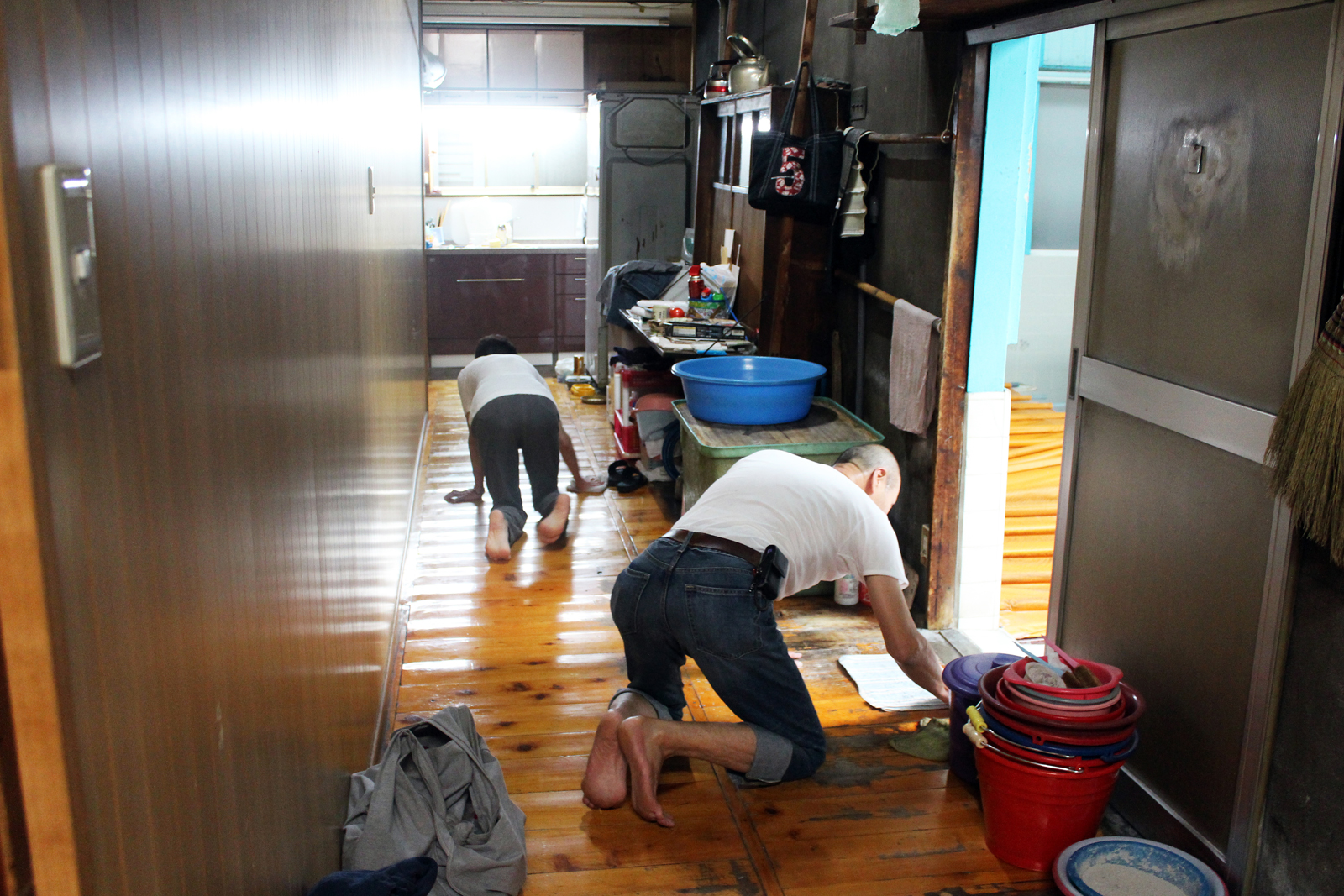 ▲写真8:「おとめ湯」を維持してきた夫妻による毎日の雑巾掛けの様子。(クリックで拡大)