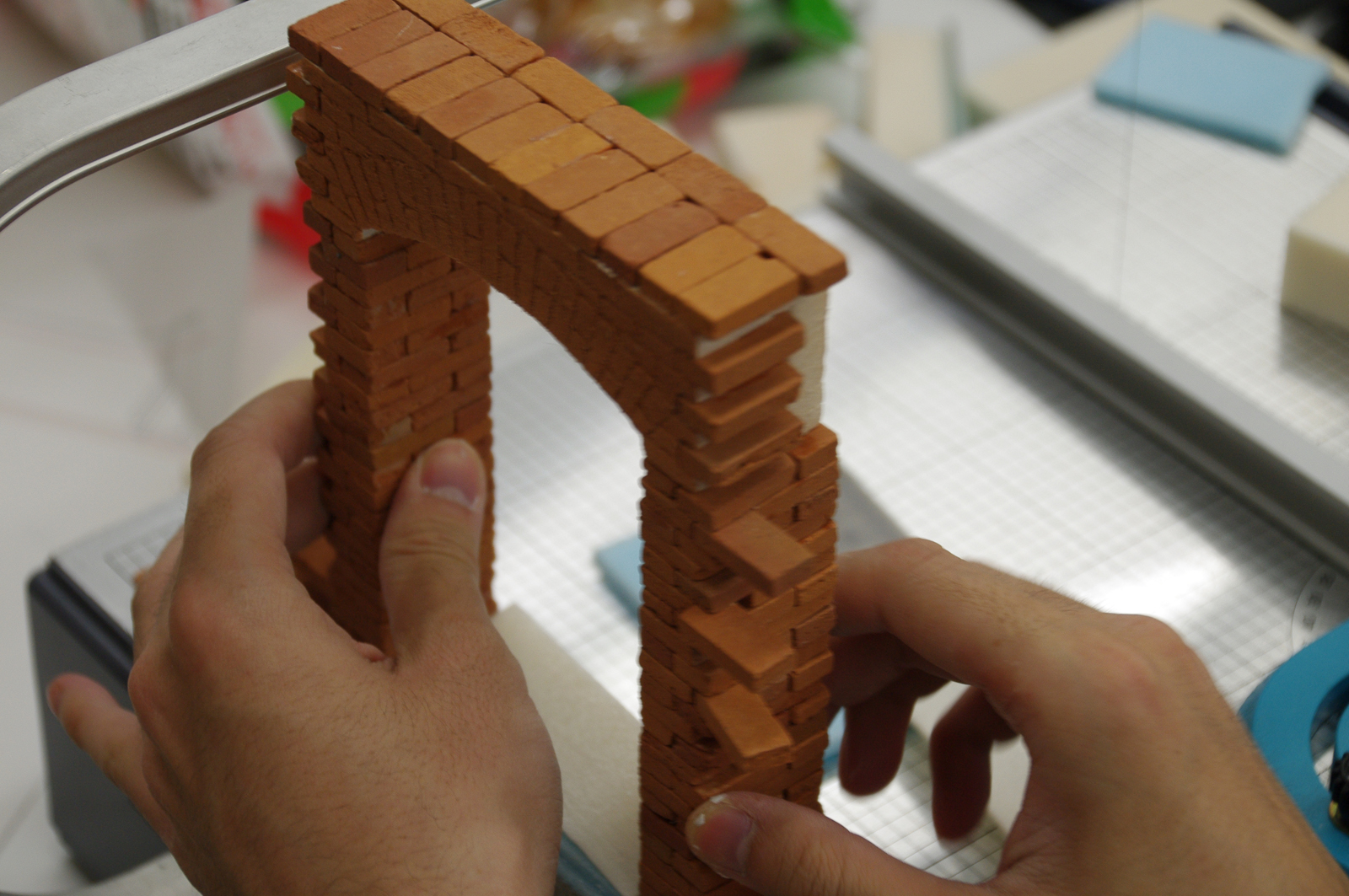 ▲煉瓦を1枚、1枚積んでいく。結構、煉瓦の積み方は複雑。(クリックで拡大)