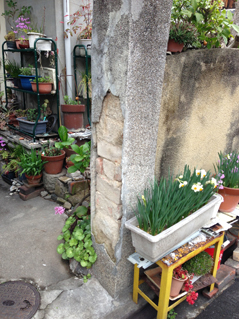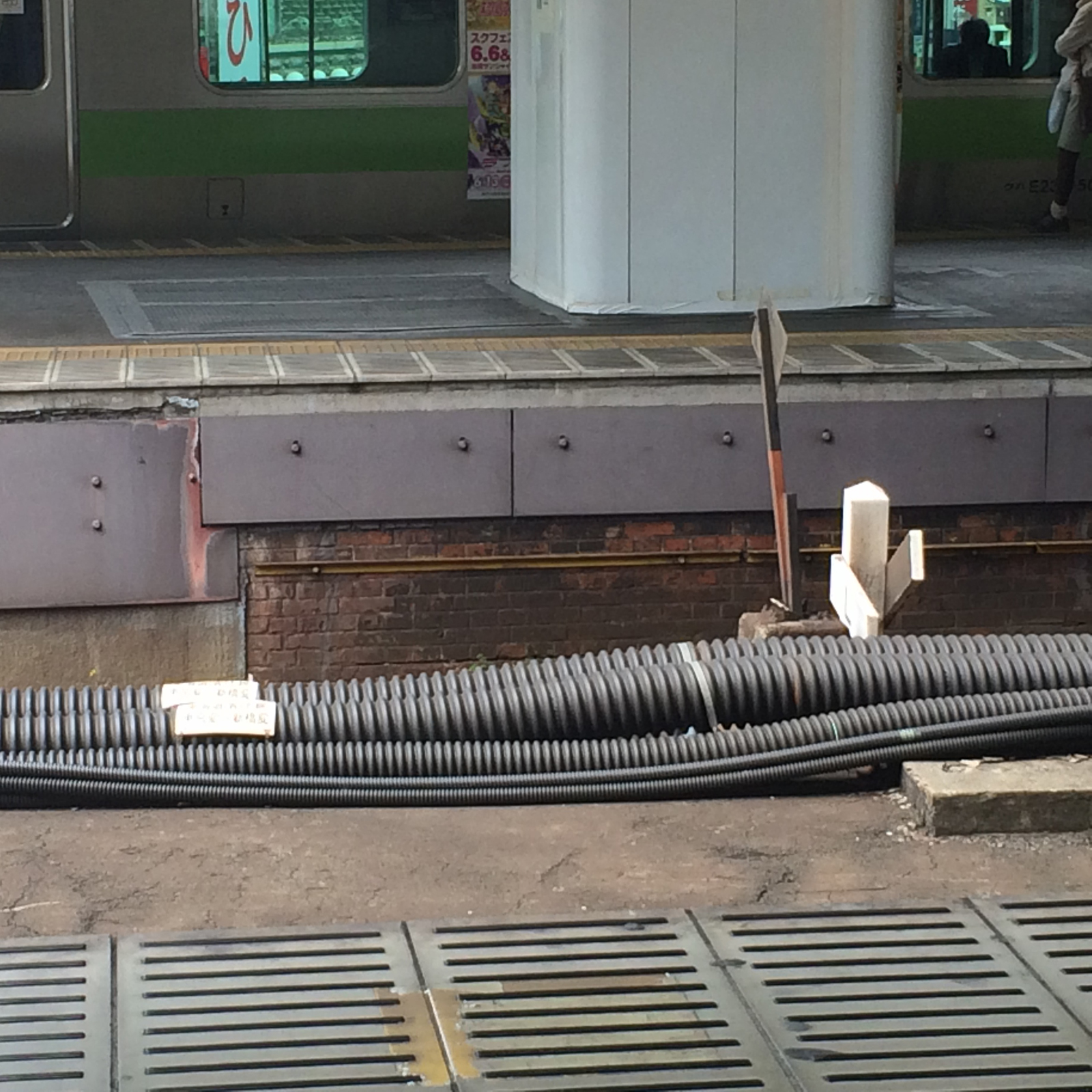 そうこうして、煉瓦ばかりに気持ちが集中すると、ふと目に入ってくる景色のなかに、じつは煉瓦が隠れていることに気がつく。ここでは、とりあえず「隠れンガ」とでも名付けておこうか。別にあえて隠れてた訳でもないだろうが、それだけ縁の下の力持ちは目立たない(私も人生、そうありたい)。植木鉢の下に敷かれた煉瓦を見つけることもあれば、住宅の基礎に使われていたりする。また都内でも、電車のプラットフォームに煉瓦が積まれているのを見つけることもある。そこかしこ、町の足元に煉瓦が眠っていることに気が付かされる。