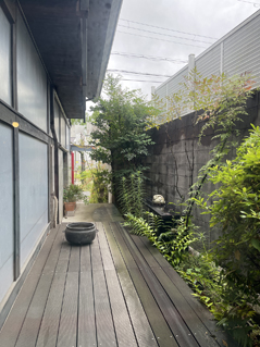 転じてここは、大阪の千里ニュータウン内にある私の家。左手に我が家の外壁が見え、右手には隣の家のブロック塀が見える。数年前、あまりに暑い大阪の夏に耐えかねてエアコンを1台増設、エアコンの室外機がブロック塀の前に設置されたが、あまりに無造作なので事務所のスタッフに頼んで、Jパネル(国産杉の3層クロスパネル)を真っ黒く塗ってもらい、室外機の上にポンと置いてもらった。
