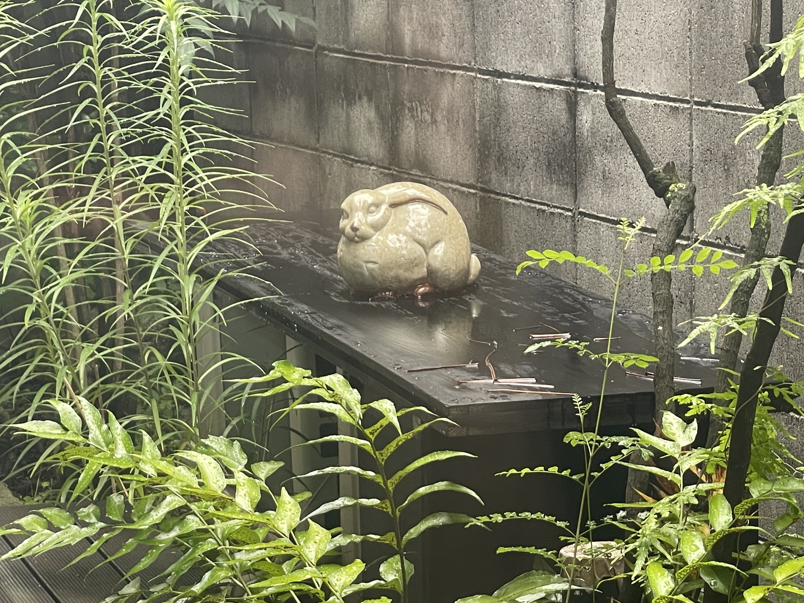 陶器であるこの兔の置物は、ずいぶん昔に岐阜のある骨董屋で買ったもので、長い時間、大阪市内にある事務所の庭に置いたままだった。兔がここに来てからは、毎朝、窓のブラインドを上げて彼女と目を合わす。この愁いのある表情を見て、なにか安心するような心持ちになるのが不思議だ。