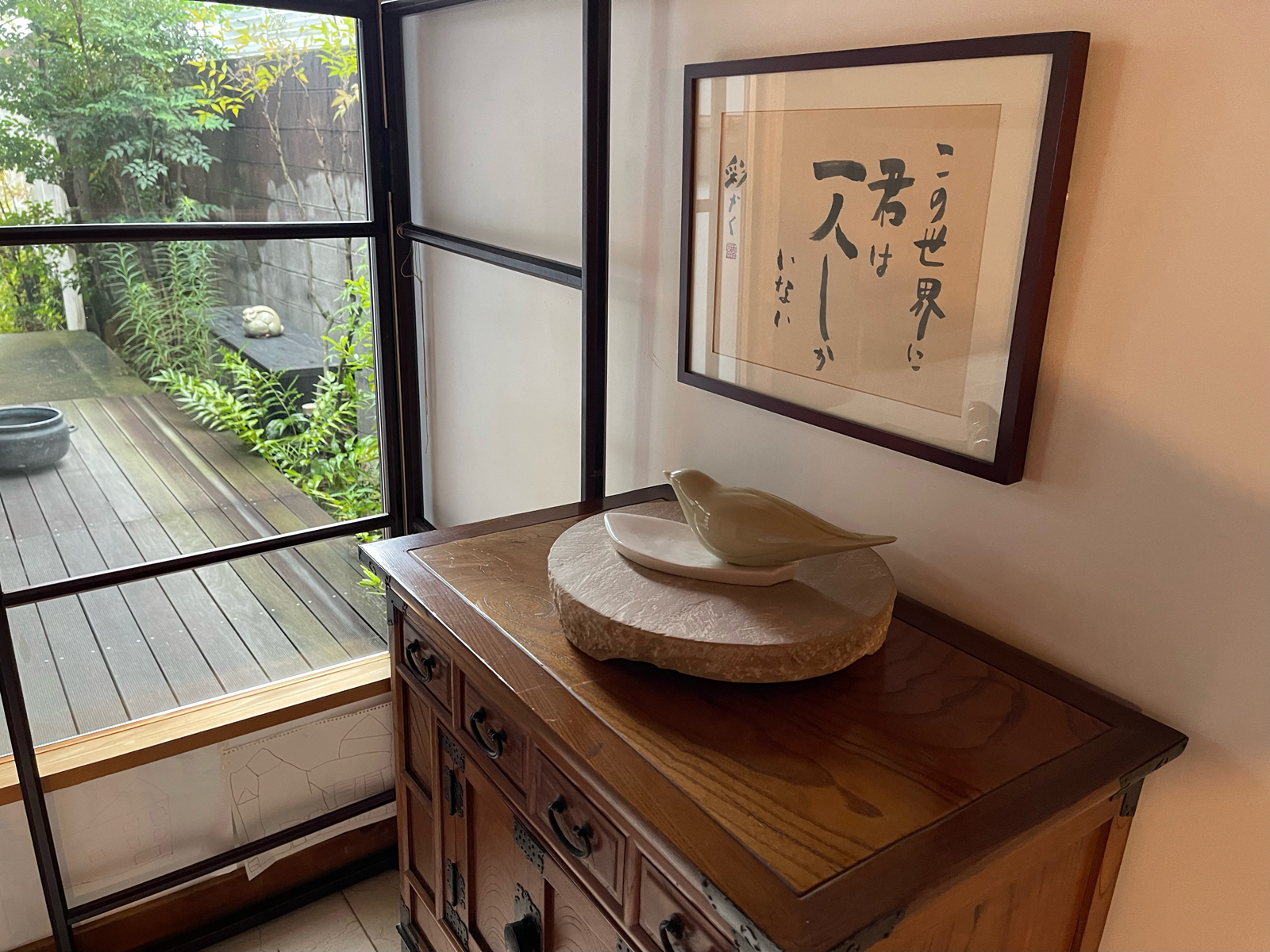 家の中には、季節のしつらえをする飾り棚があり、ここには今の時期、鳥の置物が置かれている。その鳥と外にいる兔は、FIXガラスを介して、まるで見つめ合っているようだ。