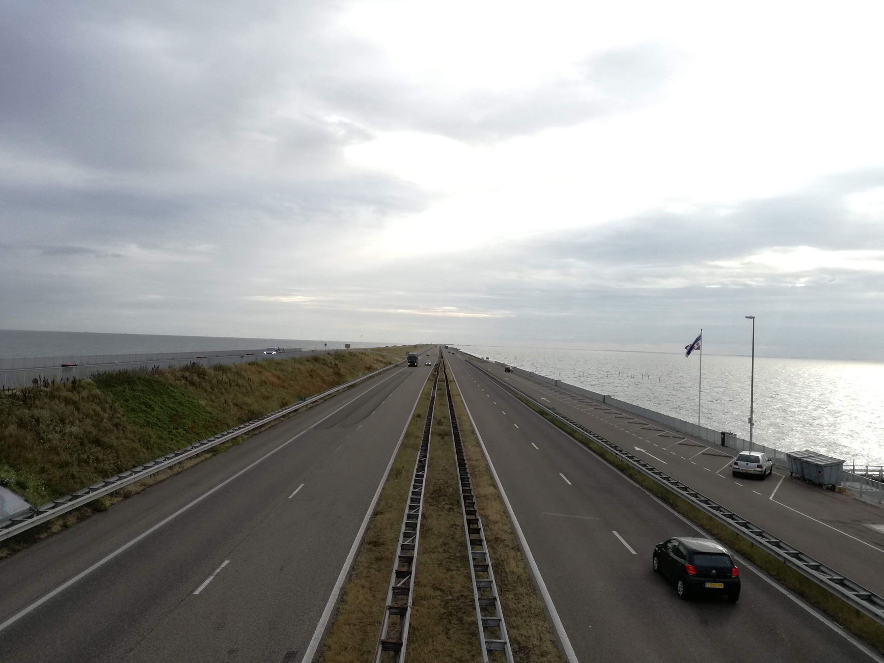 ▲北海とアイセル湖を仕切る、全長32キロメートルある締め切り大堤防。水位の差が見られる。