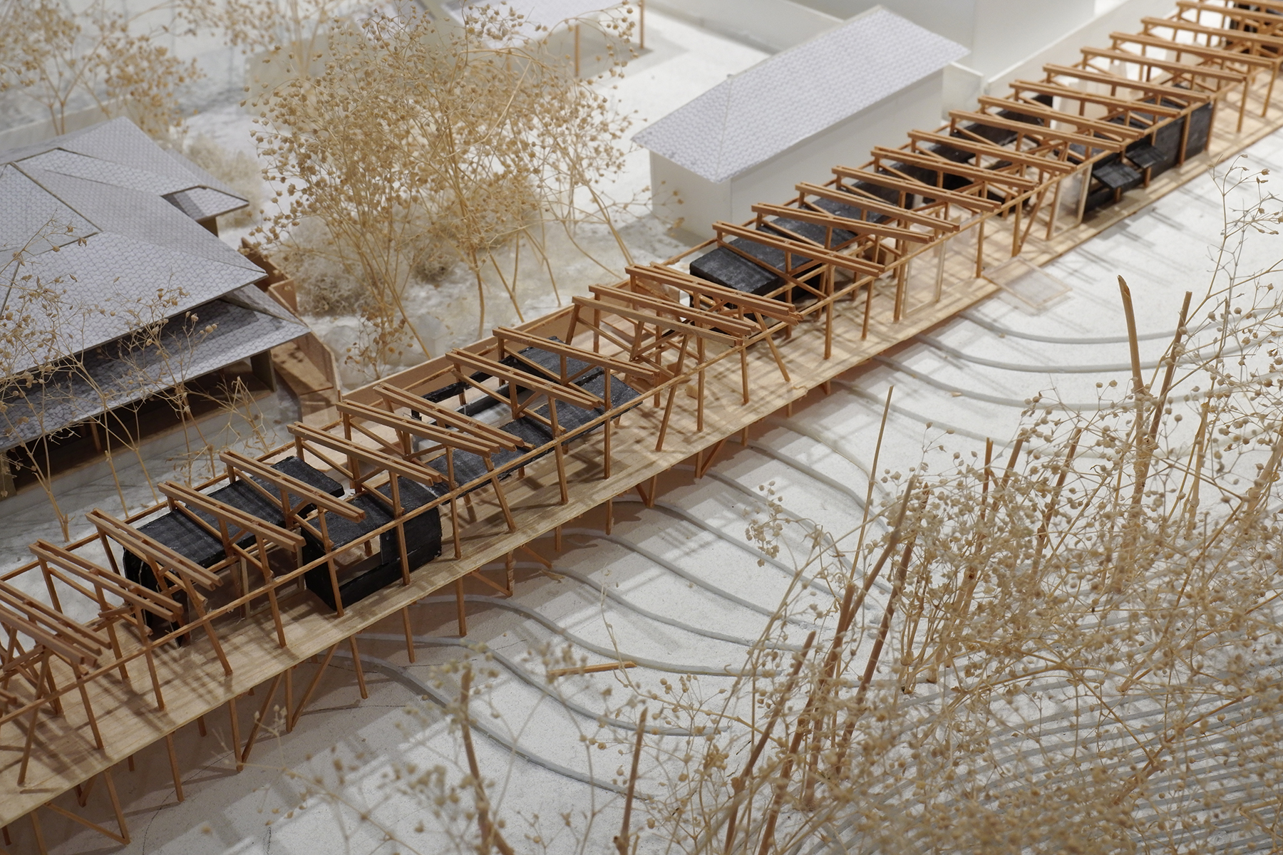 設計の段階では、敷地から制限、厳しい建設コスト、途中にはコロナとウッドショックさまざまなことの整理と、彼らが求める建築の原型である「縁側」の発見があった。敷地に対して、52間の大きな縁側状の構成が見えてきていたのだが、生活の場としては少し強過ぎるような気がして、構造体に負けるように入子構造の内部空間を挿入して、柔らかくていろんな場所をつくっていく方法を思いついた(写真6)。