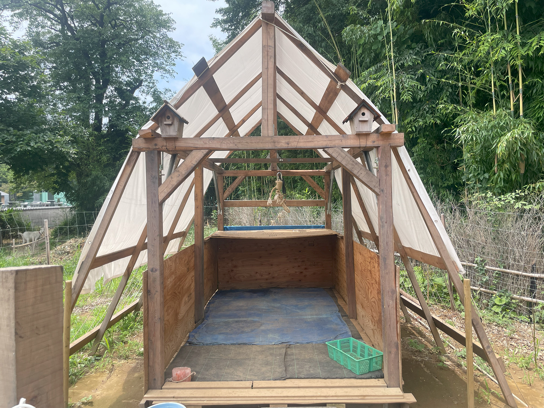 この方法では、自分で大きなフレームを設計しているのだけど、まるでリノベーションしていくようにカジュアルで生き生きとした形が現れてきた。このあたりから段々と無意識的な世界を感じ出していたのだけれど、これより先には、庭造り(写真7)やヤギ小屋(写真8)が地域住民と関係者によって作られていった。さらに木造のフレームに、おじいさんが子どもたちのためにブランコを取り付けたり(写真9)、この場所がまるで生きているような不思議な感覚を持った。私は大きな流れの中に、ぽーんと放り出されて、自分にだけできる「仕事」だけを夢中になってやっていた。池の穴を掘る人がいなければ、スコップを持って穴を掘った。