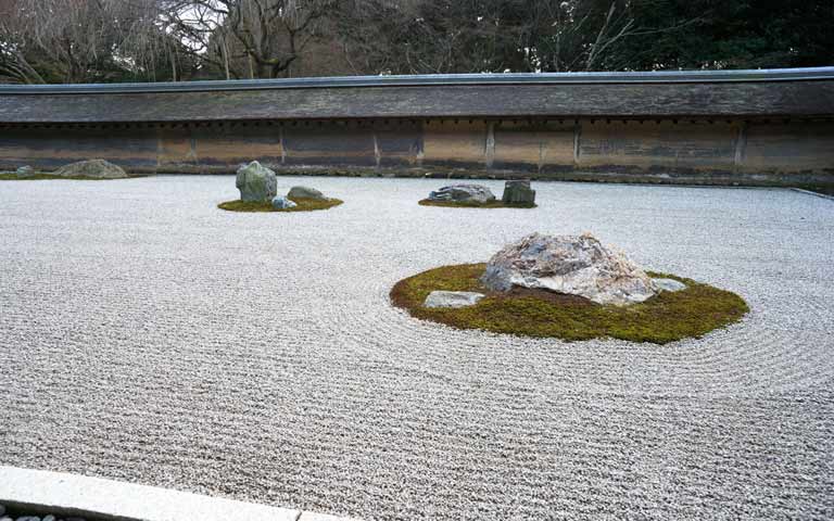 これに対して日本庭園は、精神世界への導入装置としてつくられている。たとえば禅寺に多くみられる「枯山水」。禅宗の僧は山の中で修行するのが理想だそうだが、やむなく室内で修行するとき、身近に自然を模した庭を必要とした。枯山水とは、石と砂と苔でつくられた“大自然のミニチュア”。思索を深めるためのイメージ装置だから、自然を単に写すのではなく、竜安寺の石庭のように大胆に抽象化されることもあった。