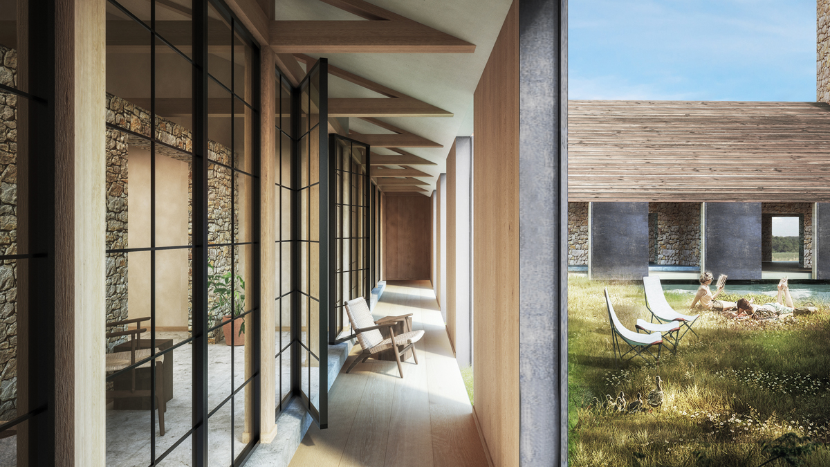 ▲マニフェストを下敷きにして発展させたニューノルディックレストランのためのホテルとアーティスト・イン・レジデンスの提案。北欧のデザイン言語・素材を参照しながら、列柱空間や半屋外など新しい要素を挿入して新しい空間が作れるか模索しました。(クリックで拡大)