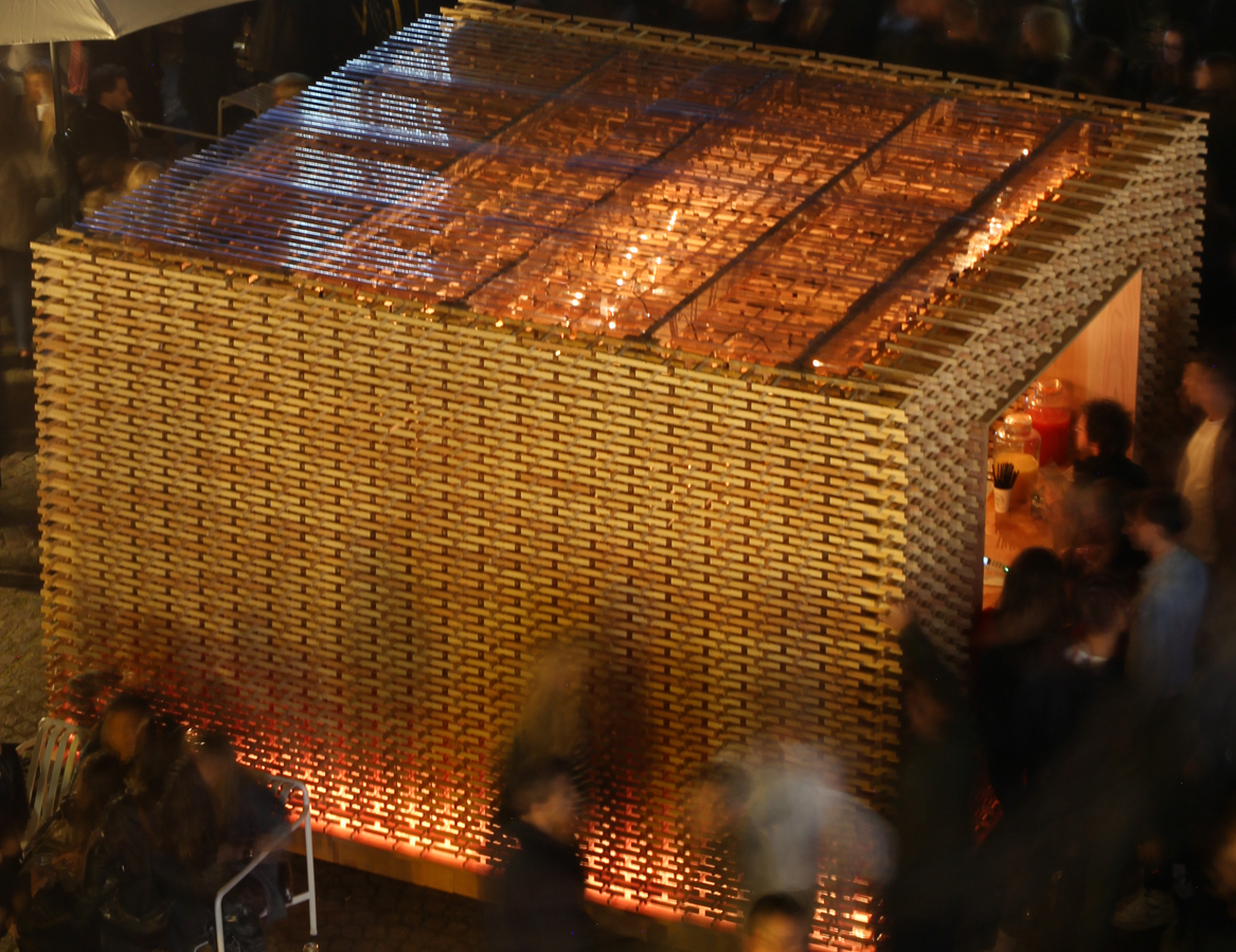 ▲芸術祭用のパビリオンの設計・施工。デンマークの無垢フローリング会社ディーネセンに協力してもらい、デンマークのレゴのシンプルさ、遊び心に日本のもったいないを組み合わせてフローリングの端材を30センチの小さなモジュールにして組み上げパビリオンを作りました。(クリックで拡大)