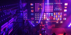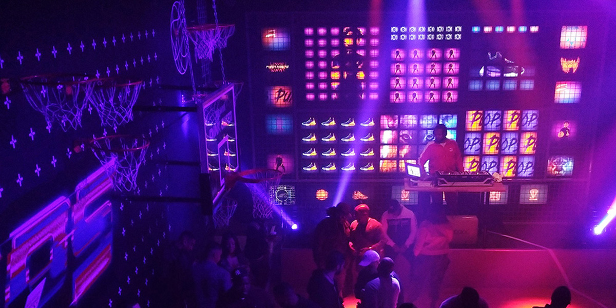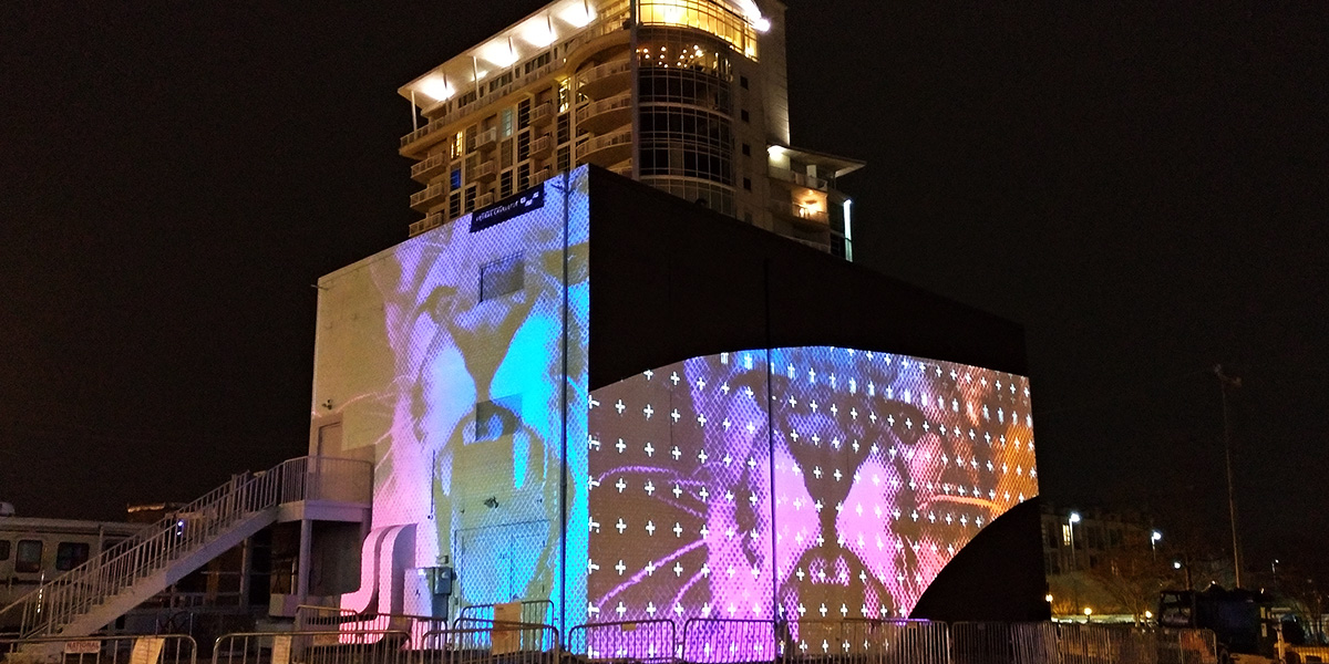 2月にノースカロライナ州シャーロットで開催されたNBAオールスターゲームの特設ブースの演出を担当しました。巨大なTVスクリーンを設置し、試合の様子やイベントに応じたグラフィックをリアルタイムで制御できるようなシステムを構築しました。建物の外側にはプロジェクションマッピングを施しています。会場内にはバスケットゴールが設置され、日中はダンクコンテストやスキルチャレンジなどのイベントが行われ、夜はアフターパーティーの会場にもなりました。アートディレクションはニューヨークのデザインスタジオ、エージェンシーと制作はロサンゼルスという役割分担でした。