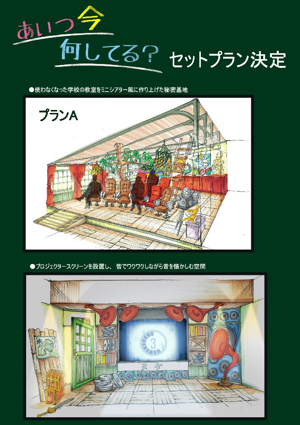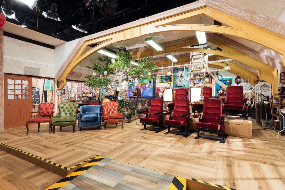 ミニシアター付きオトナの秘密基地に改装した廃校の教室に、司会のネプチューンさんに招かれたゲスト。360度セットで囲ってスタッフの姿を見えなくし、VTRに集中できる環境を整えます。あとはどれだけ楽しい要素を加えていくかです。学生時代、友だちとたくさん撮ったポラロイド写真や、互いに書き合った似顔絵、青春の象徴である部活グッズや授業で使った筆記用具、こっそり学校に持ってきていた自慢の宝物…誰もが経験したであろう青春時代の時が止まってそこにあり、見ている人の心の琴線に触れるよう仕掛けます。このように番組コンセプトを可視化し、出演者を引き立てるお手伝いをしていきます。