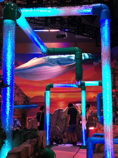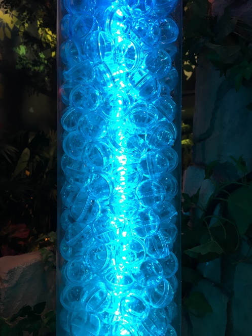 例えば「謎のパイプ島」にある特殊な液体が流れているパイプをどう表現するか。実際の水を使うのは重量問題もあり現実的ではないので、春雨、消臭剤ビーズ、発砲スチロールなど、さまざまな素材を試しました。その結果ガチャガチャの透明カプセルがいちばんしっくり来て、透明アクリルパイプに詰めて光を当てるとまるで液体が流れているように見えることが判明しました。