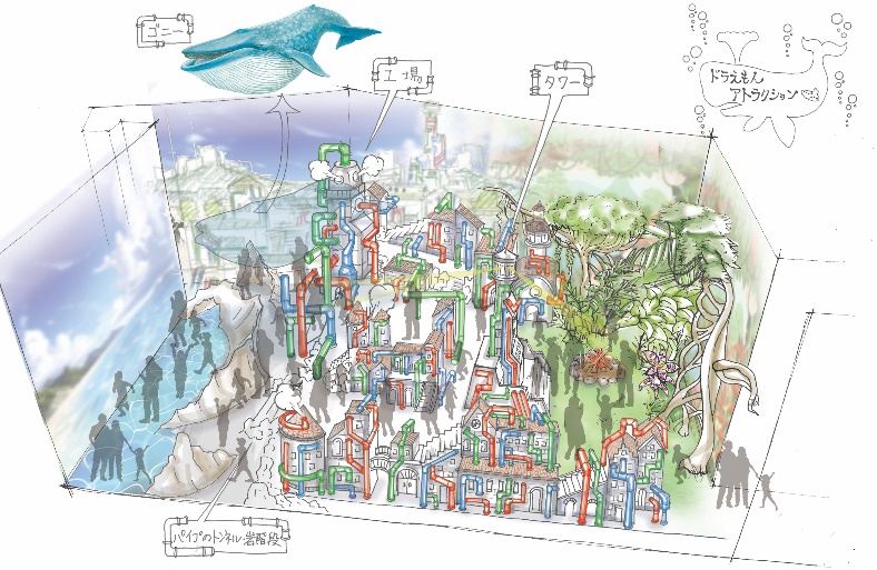▲それと同時に、ゲーム内の“起承転結”をプランニングします。まず会場に入った時の最初の驚きの仕掛け、演出のピークをどこにもっていくのか、そして不意打ちの最後の驚きをどういったものにするかなどすべてに意味を持たせた配置、デザインを考えていきます。(クリックで拡大)