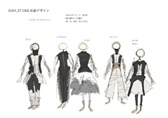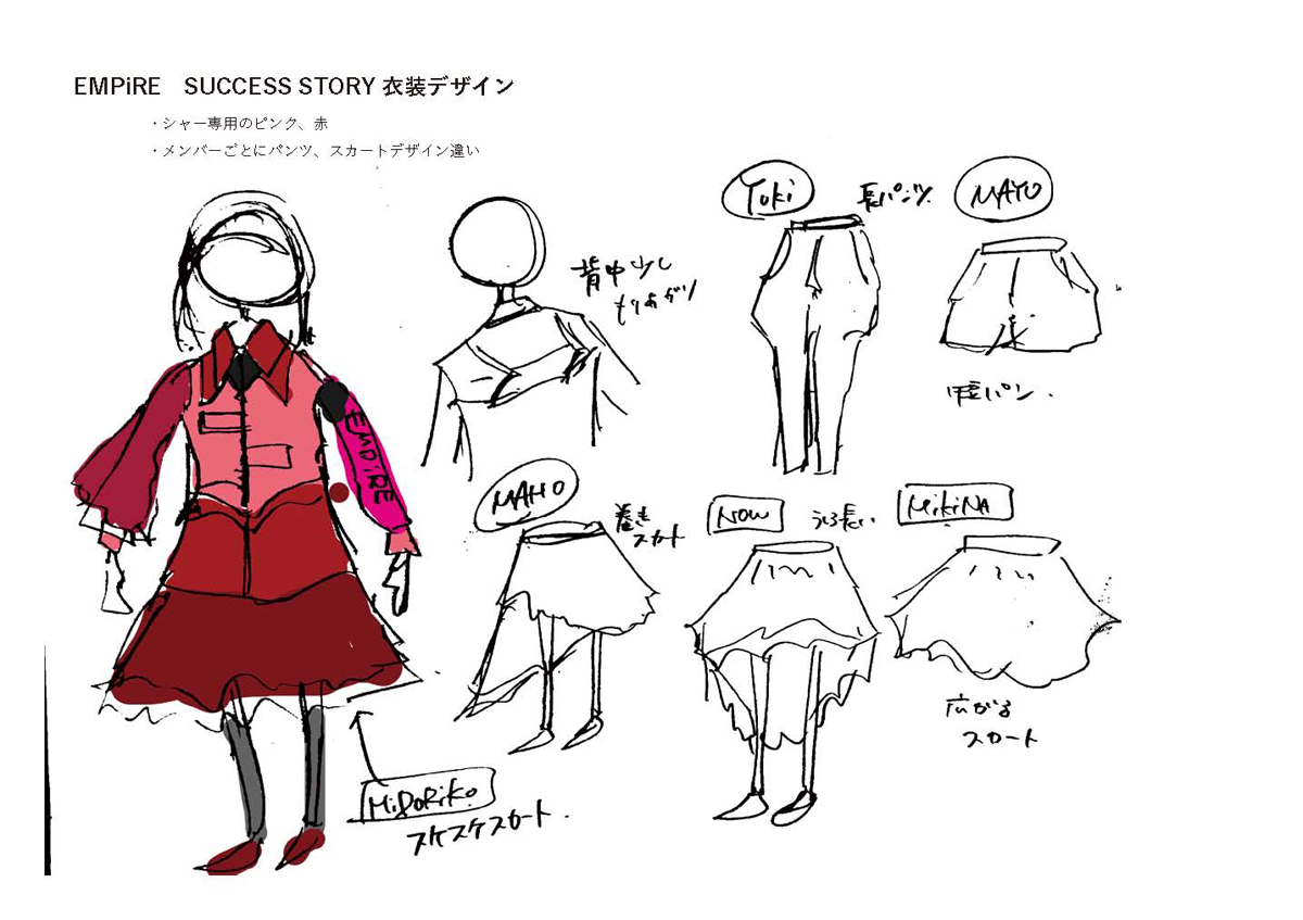 ●アーティストの衣装デザイン 私の仕事は音楽系の中でもバンドではなく、歌って踊ってライブをする一般的にアイドルと言われるアーティストの衣装です。デザイン上考えなくてはいけないことがあり、そのことについてもう少しお話ししたいと思います。 まず、仕事をいただく時点では、新曲の発表に伴ってCDジャケット写真に使用する衣装、アーティスト写真に使用する衣装の話から始まります。事務所のマネージャー、プロデューサー、レーベルの担当ディレクター、ジャケットデザインを担当するアートディレクターの間で1つの方向性、コンセプトが決まります。 その表現に向かって衣装デザインを考えます。この衣装が発表された際に一番出回るのは写真(グラフィック)です。なので、平面で着こなした良さを追求したデザインにします。衣装も1つの表現材料だと考えているので、アーティストを邪魔しない程度に衣装デザインにも豊富な情報量のあるものを考えています。雑誌や広告で一目見ただけで印象に残るものを目指しています。 その後、その衣装を着てライブを行います。そのためには、踊ることのできる動きやすいデザイン、動いたときにも印象に残るように背面にも気を使ったり、動きのある布を仕込むなどのデザインをしなければなりません。 シルエットや形のデザインを考える上で、平面と動きという2極を混じり合わせたものを作り上げないところにデザイン力がかなり必要になると思っています。実際は、ジャケット写真やアーティスト写真も私に撮らせていただくことが多く、アーティストのビジュアル表現においては、充実した仕事をさせていただいております。