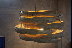 ▲SAKE TARU LOUNGE。薙(たが)を組み合せて製作した照明「タガシャンデリア」。(クリックで拡大)