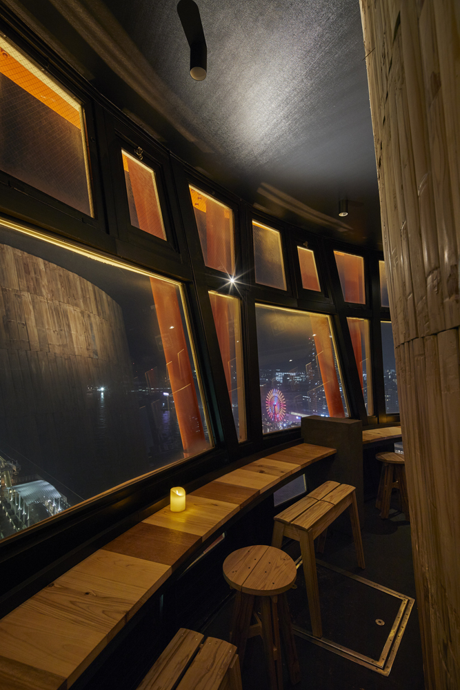 空間のコンセプトはまさに「巨大な酒樽」。自社で樽を製作している菊正宗酒造様のご協力のもと約60樽分の酒樽をポートタワーの平面形状に合わせた円形の壁面に1枚1枚酒樽を貼ることで「巨大な酒樽」を製作しました。その「巨大な酒樽」から提供される「灘の酒」を楽しみながら神戸の風景を360度体感することができます。酒樽のほかにシェアウッズの山崎正夫さんの協力のもと六甲山の間伐材や街路樹を活用したカウンター、木の工房KAKUの賀來寿史さんを中心にDIYで製作した酒樽材のスツール、studio tanboの池畑善志郎さんと製作した箍(たが)を重ねた照明「タガシャンデリア」など、たくさんの人との協同によって空間がつくられています。