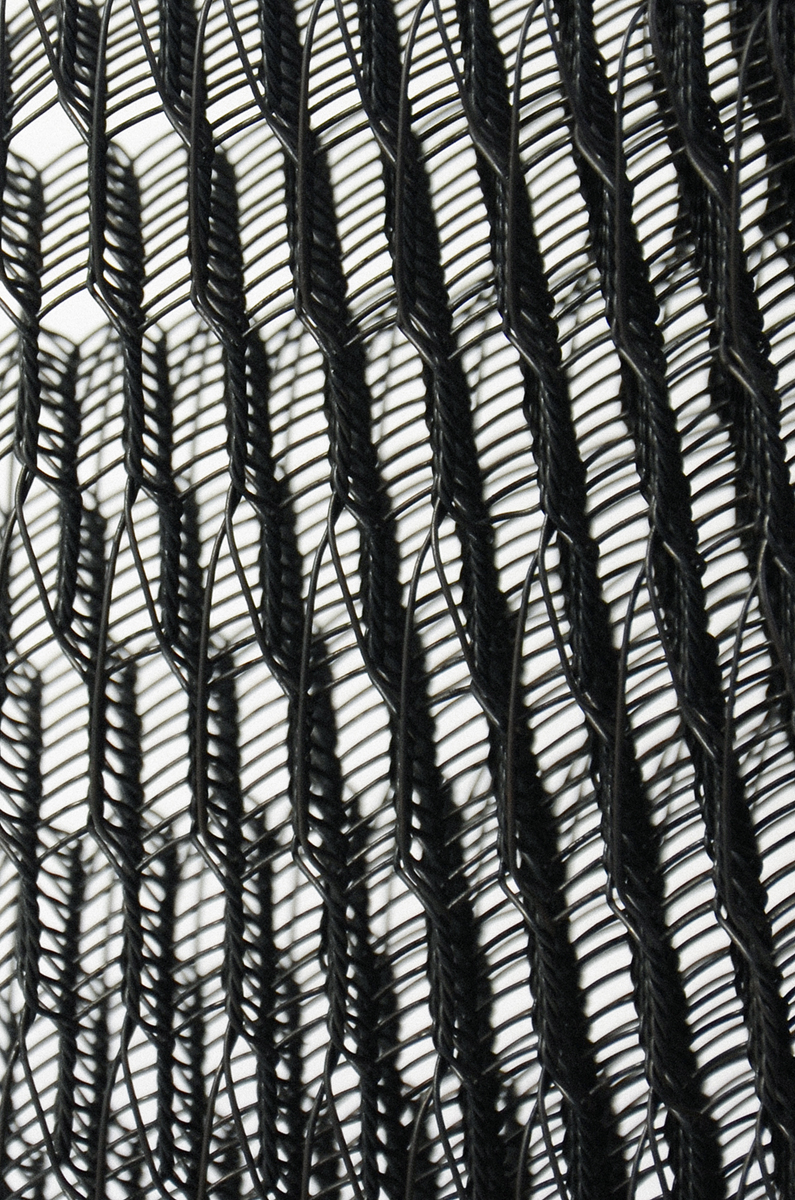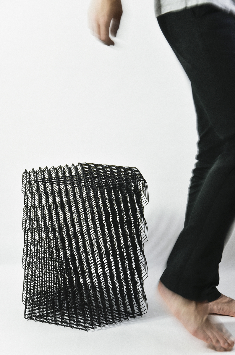針金を撚るという単純作業を反復させることで、素材の美しさや加工技術の高さに依らない、純粋な作業量による魅力の創出を狙ったそのスツールは、製造方法が要。治具からの開発を行い、「尺度」を用いて最適な針金の素材や径などを選定することで、人の手の介入しない製造工程における表現手法を探りました。