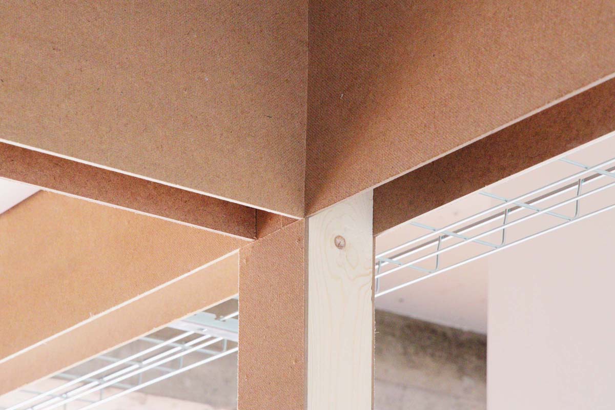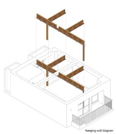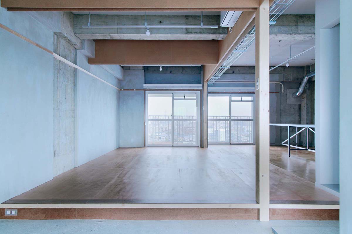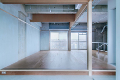 を考え、新しく挿入するモノによって新しいものと古いものを架橋するようなあり方をハードボードの垂壁とメッシュラックを設置することで実現しようとしています。この垂壁は下側に溝のようなものがあって、壁を新設したり、ロールカーテンを仕込んだり、突っ張りツーバイフォー材を入れたり、ある程度DIYもできるようなものになっています。