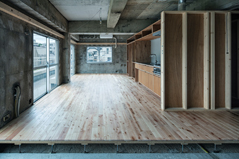 また、このハードボードの素材感が新しいものにも古いものにも馴染むようなもので、コンクリートの荒々しい躯体や、補修されたモルタル、既存の長押などとバランスしながら和風洋風問わず、さまざまな家具を受け入れることができる空気感を作っています。