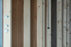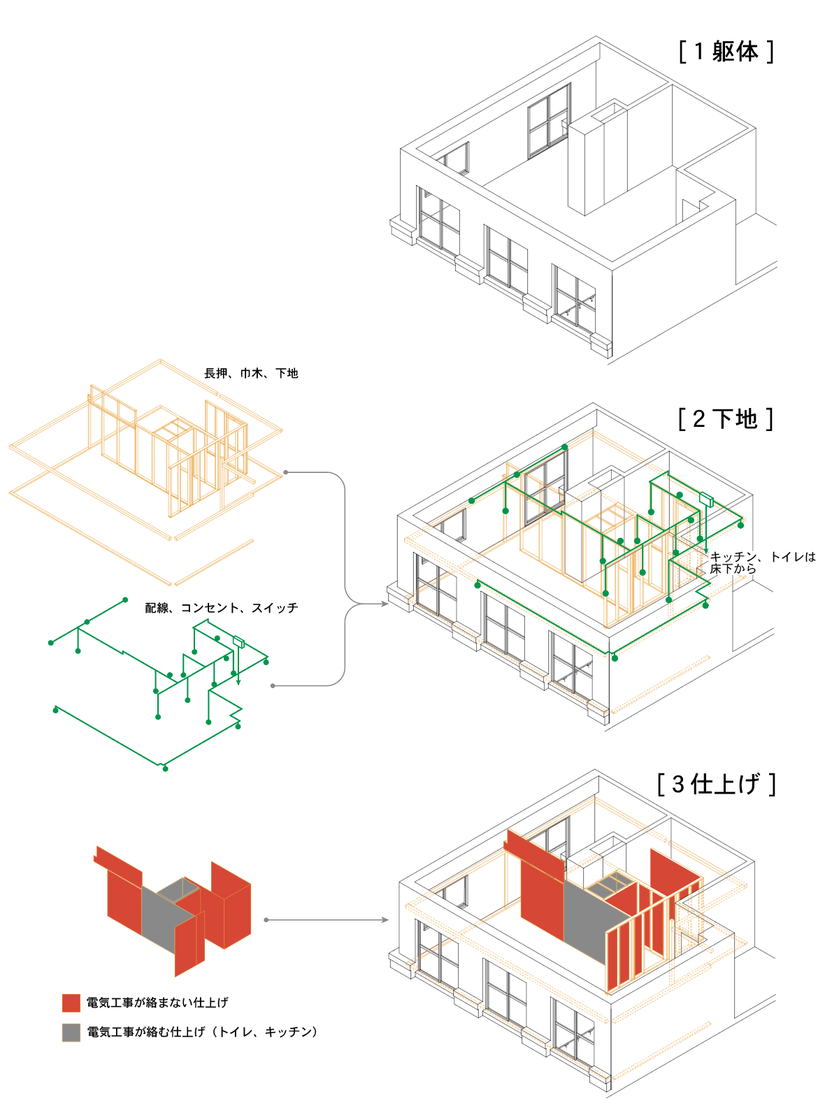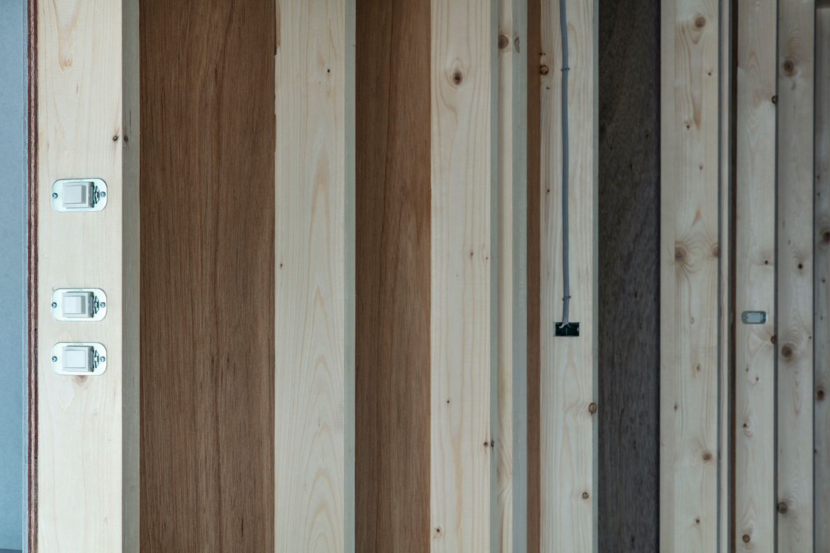を考え、「長押」と「巾木」をDIYの最低限のインフラとし、一般的には仕上げ面に現れてくる電気スイッチ、コンセントを下地のレイヤーに整理し、仕上げ面を電気工事なしで変更できるようにすることを考えました。