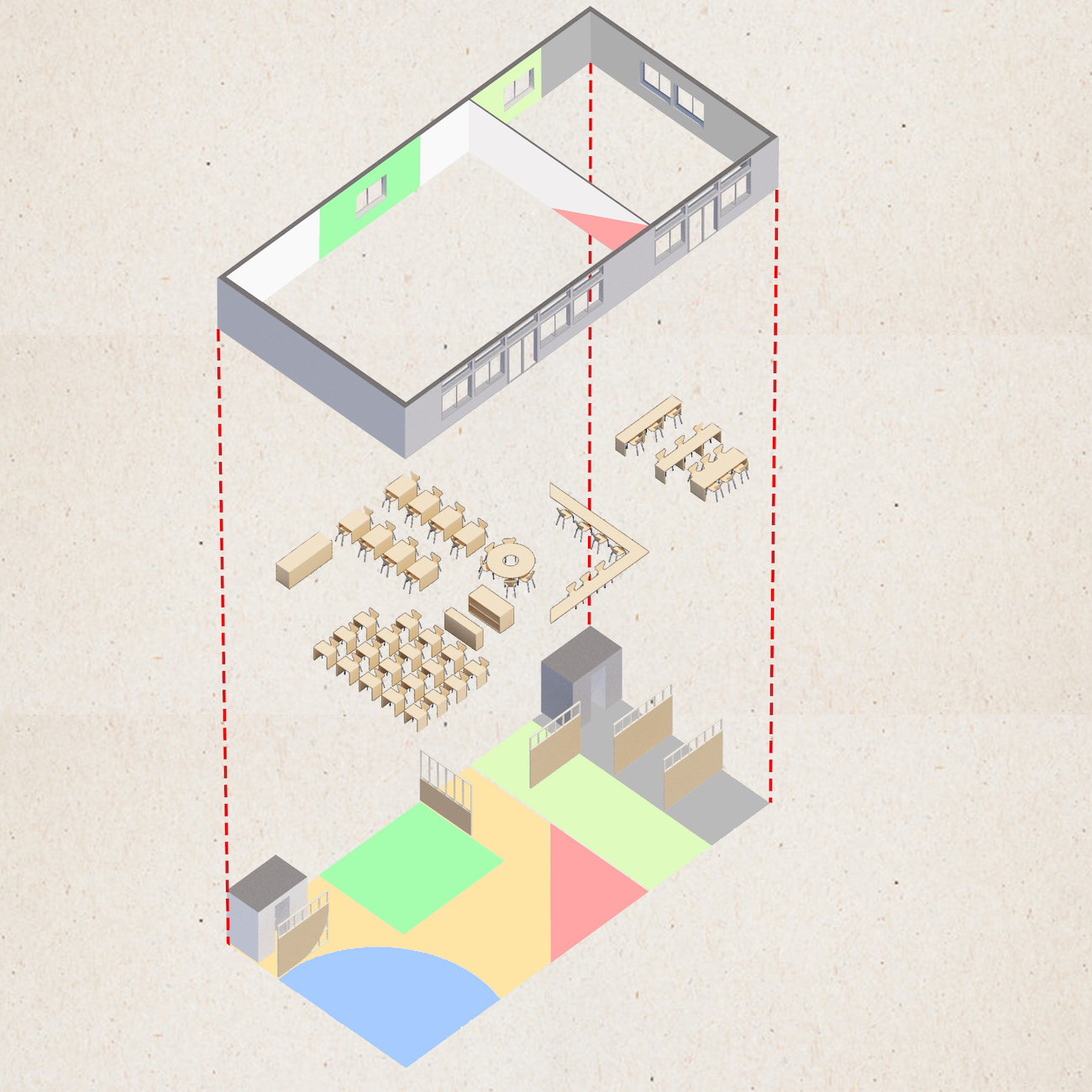 新潟市にあるAIを取り入れた自立型の個別指導塾の計画。大きなワンルームに色を配した図形の学習スペースを散りばめ、図形によって生まれた地を共用部とする構成とした。平面的に仕切られた空間の中で個々が好きな居場所を見つけて移動し学習を進めてく。自習と個別指導による生徒の自主性を伸ばす学習スタイルを空間にも反映させいった。