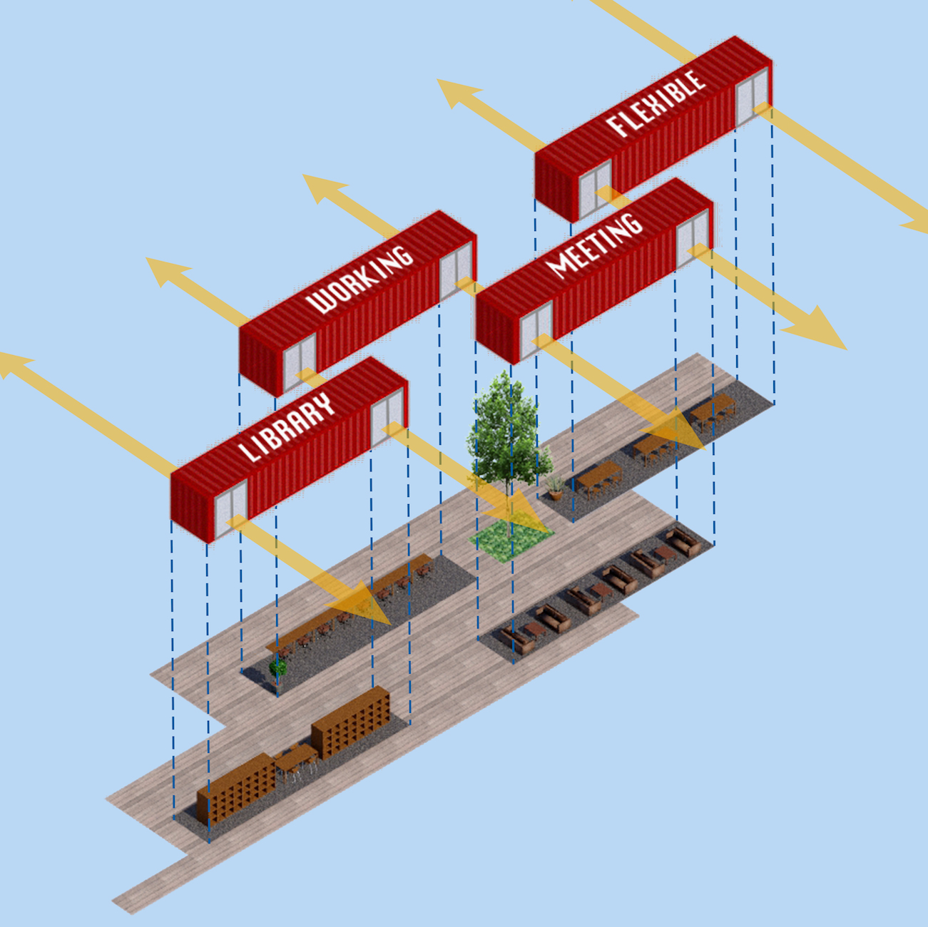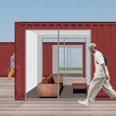 新潟に本社を置く会社の名古屋支店をコンテナでつくるプロジェクト。ワーキングスペースや打ち合わせスペースなど必要諸室と合わせて将来の増員に対応できるフレキシブルさが求められた。そこで各コンテナ端部に引き違いのサッシュを取り付け、それらが重なり合うような配置にした。