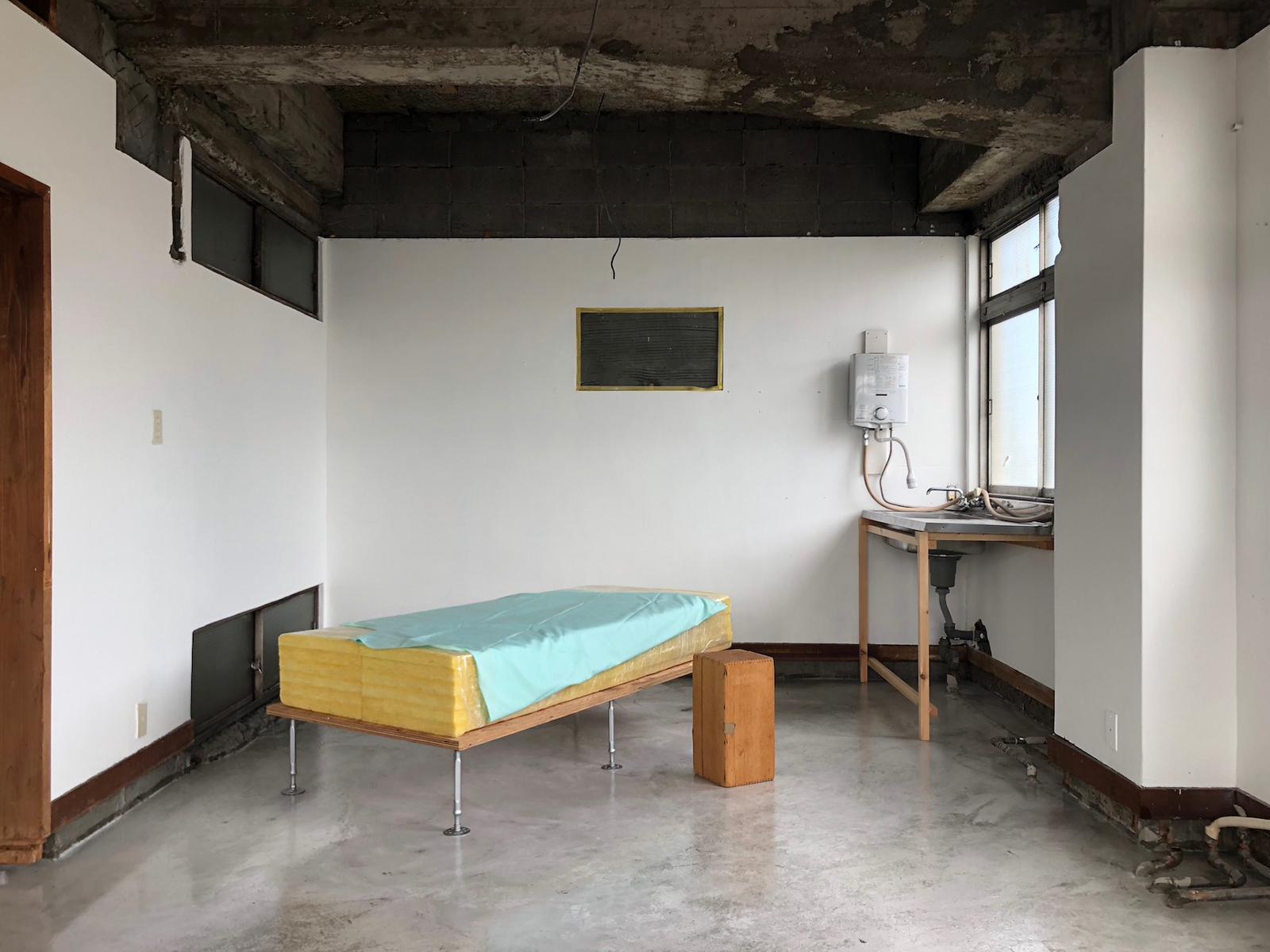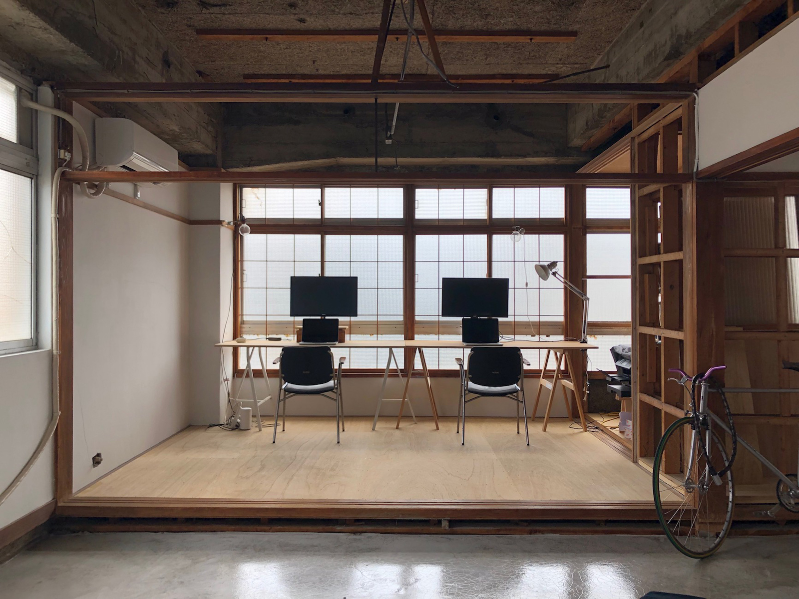 新潟市にある築50年を経たビルの1室を改装。既存の田の字プランの骨格を残しながら壁や天井の仕上げを引いていき、土間やコンパネといった床の素材を新たに付け加えることにより、視線や気配は抜けながらも空間はゆるやかに仕切られる空間構成にした。